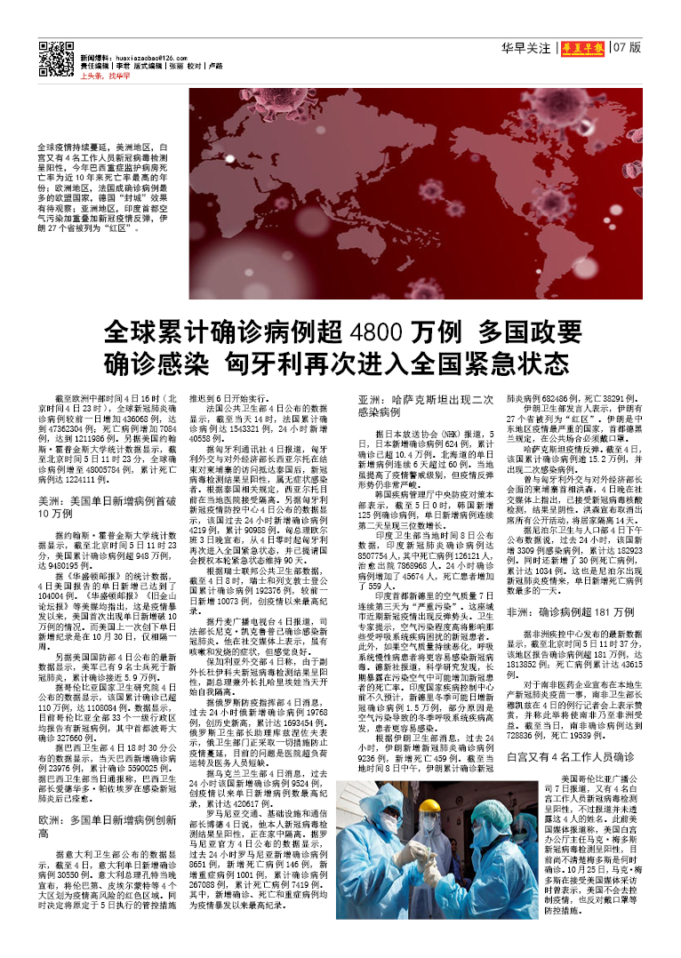 全球累计确诊病例超4800万例 多国政要确诊感染 匈牙利再次进入全国紧急状态
