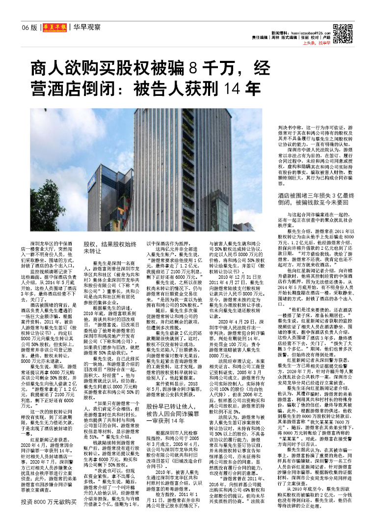 商人欲购买股权被骗8千万,经营酒店倒闭:被告人获刑14年