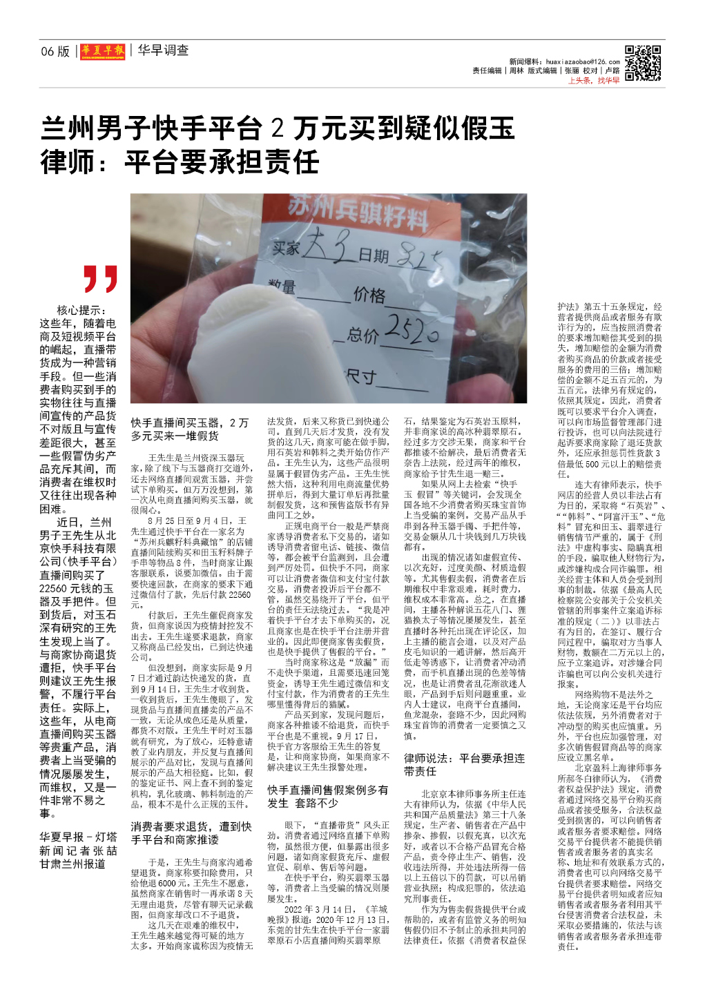 兰州男子快手平台2万元买到疑似假玉 律师:平台要承担责任