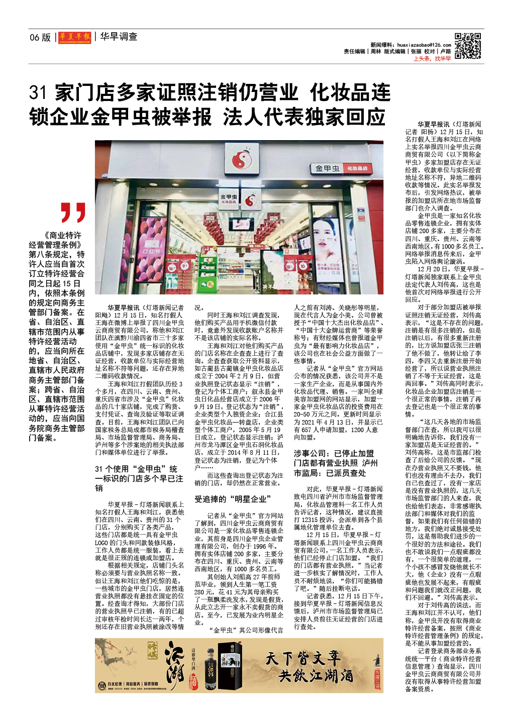 31家门店多家证照注销仍营业 化妆品连锁企业金甲虫被举报