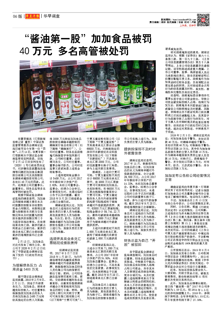 “酱油第一股”加加食品被罚40万元 多名高管被处罚