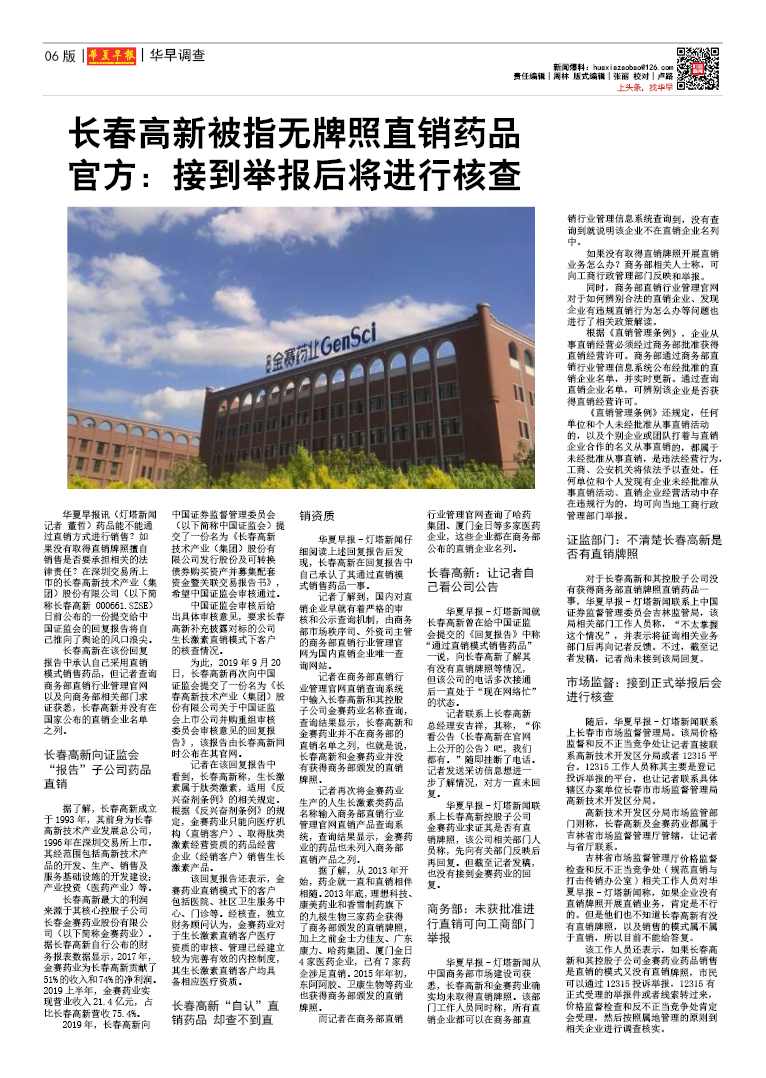 长春高新被指无牌照直销药品 官方:接到举报后将进行核查