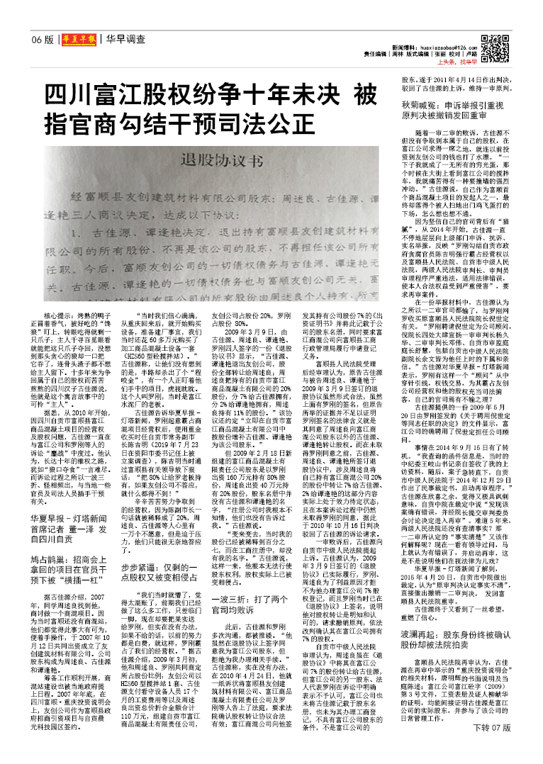四川富江股权纷争十年未决 被指官商勾结干预司法公正